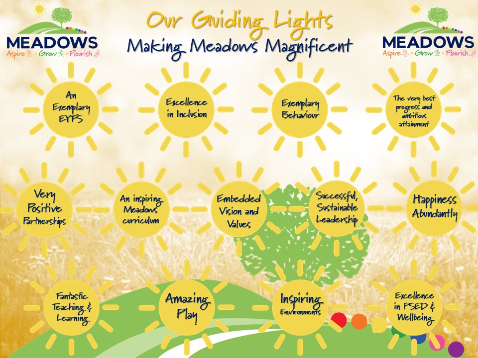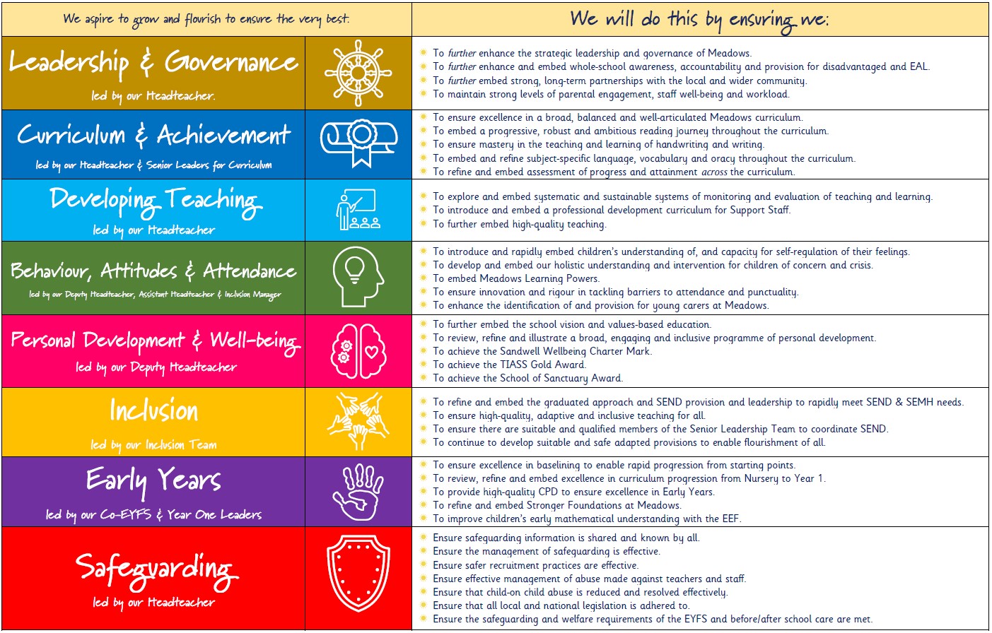 Each year, the Meadows staff and Governors work together to set key priority areas that drive our school's development to ensure our school is one which works to live by its vision - aspire, grow, flourish!