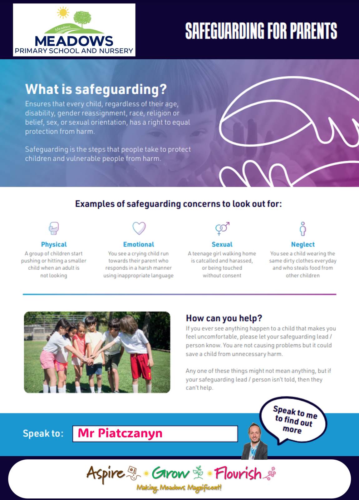 At Meadows Primary School and Nursery, the Designated Safeguarding Lead is our Headteacher, Mr Joseph Piatczanyn. He is supported by three Deputy Designated Safeguarding Leads, as pictured below.